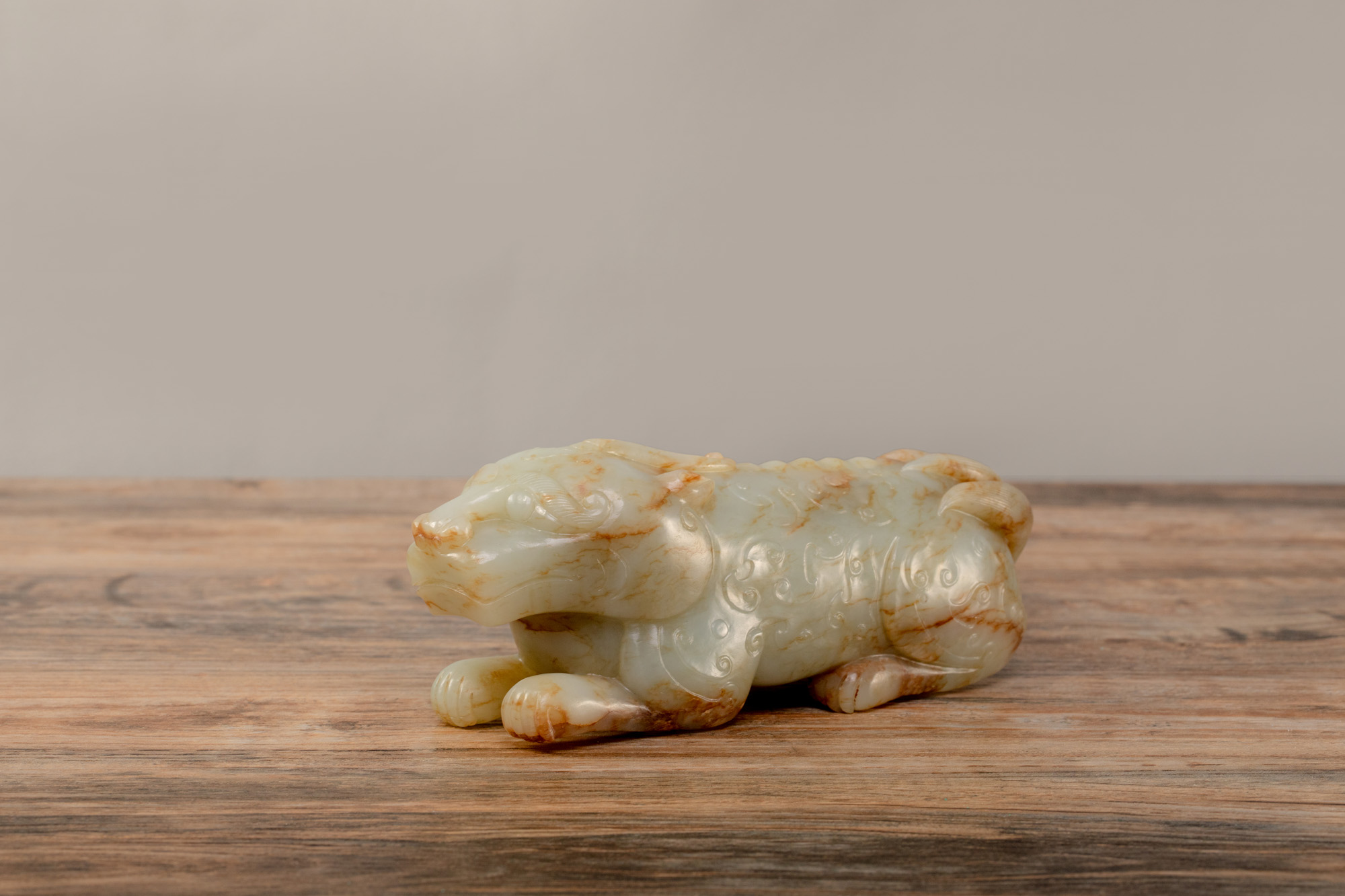 另一件臥獸「Lot 20146 明 玉臥獸」白玉質,局部帶褐色沁,體量厚實。瑞獸呈趴伏狀,背脊做凹棱狀,四肢短粗壯,周身帶淺浮雕與陰刻連續的變形雲紋。尾部化作鬚狀四尾上揚,為結合貔貅一類瑞獸特徵的表現。此獸吻部寬厚,雙耳與獨角緊貼頭部,眉眼深邃,集中於上方平面。全器體現明代玉獸造型中的粗獷特徵,顯具肌肉健壯感,頭部飽滿雄健,稜角分明。