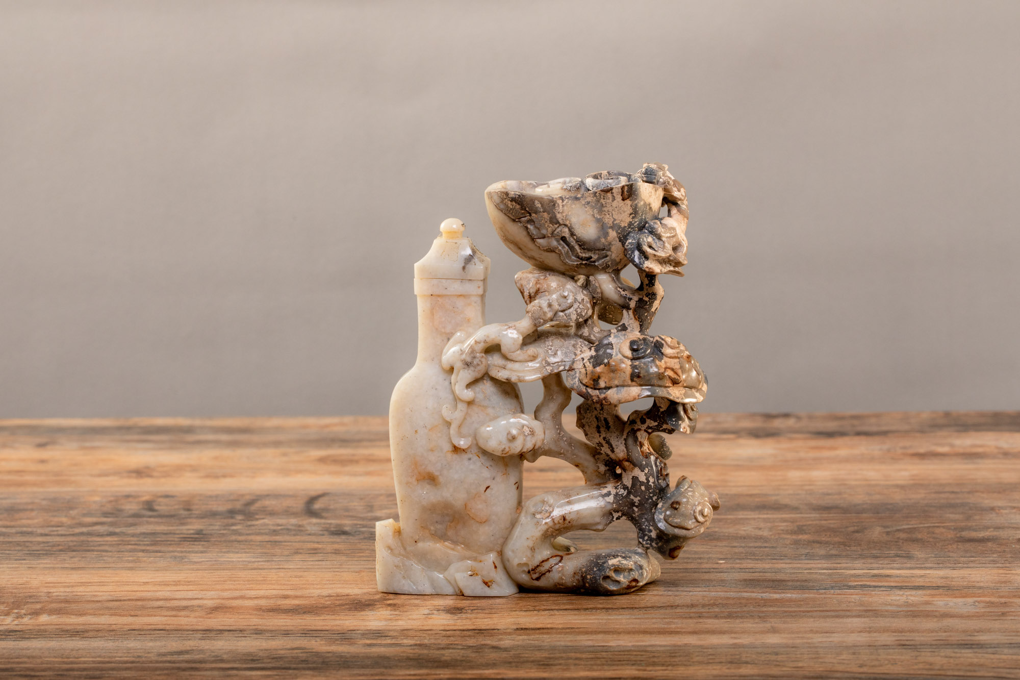 本次另一件精美拍品「Lot 20147 明 玉雕如意瓶」雕件通體潤澤,包漿完整,器形線條柔順,瓶身白皙,不規則紋路點綴其中,右方如意草姿態曼妙曲折,兩隻螭龍攀爬其上,頗有步步高升之意。
