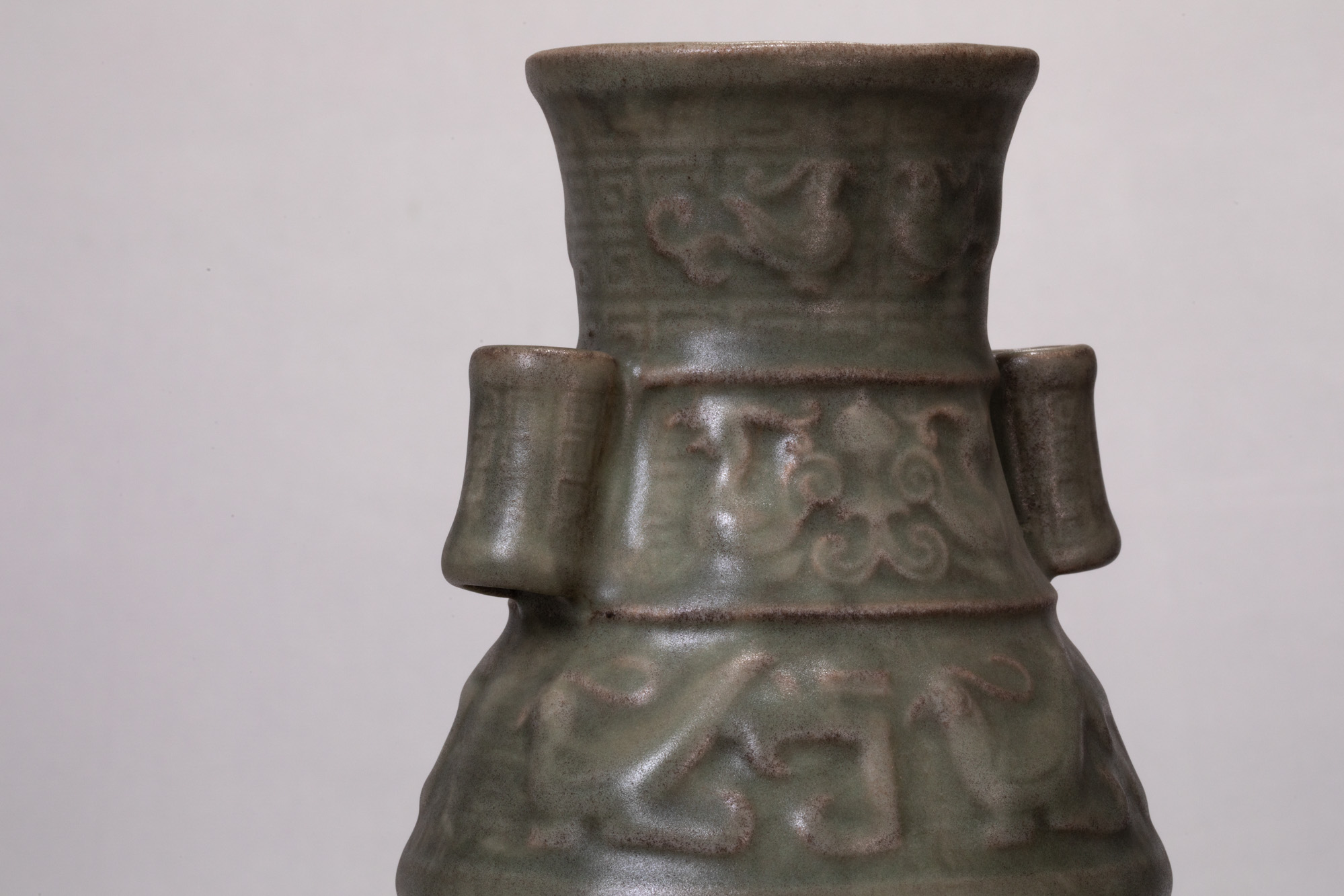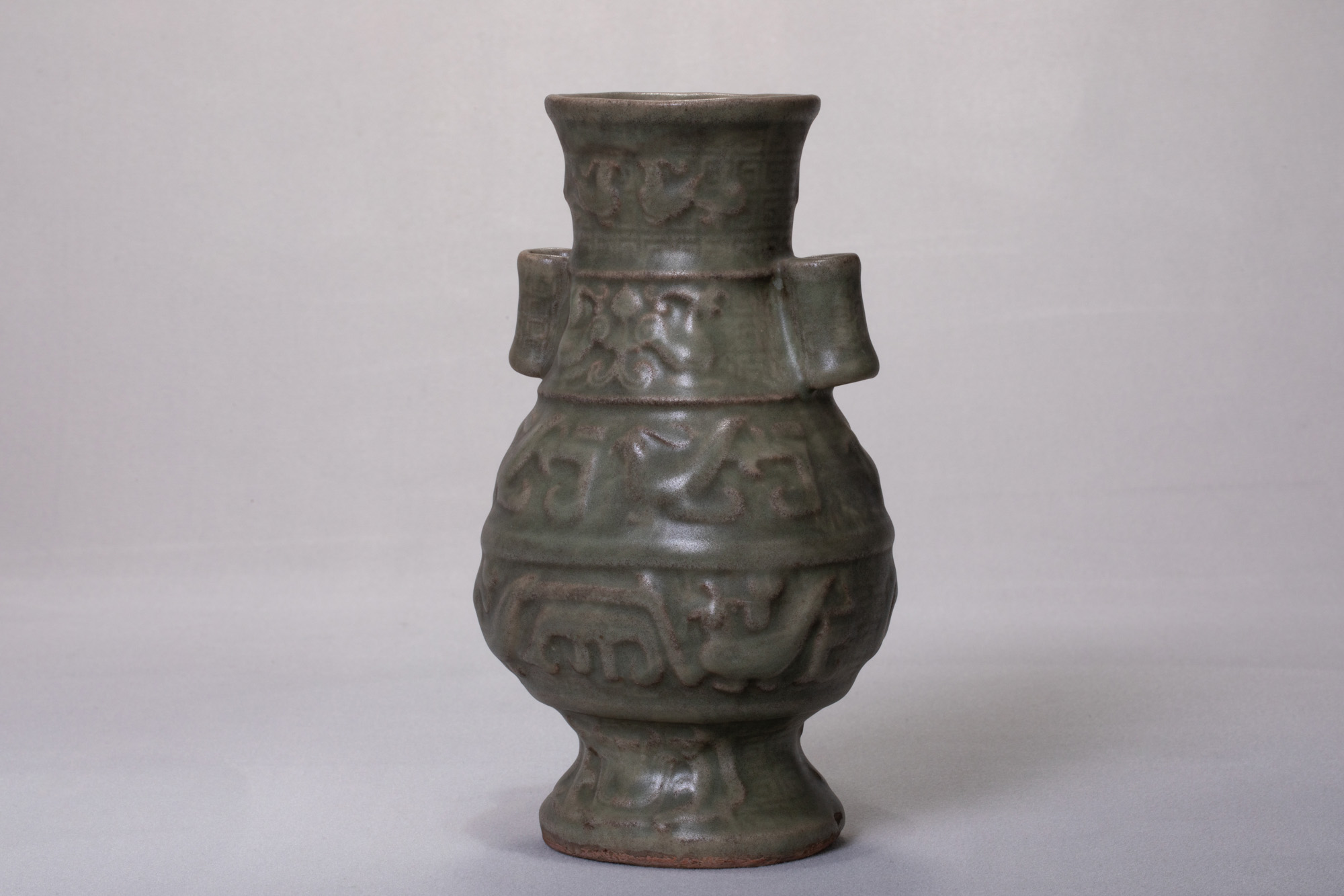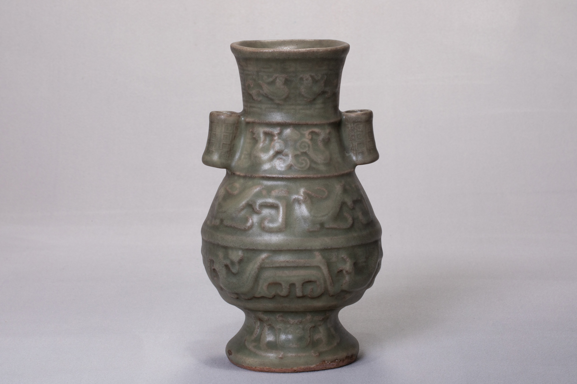14248.青釉鳳鳥紋貫耳瓶