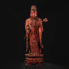 此尊木雕觀音外覆漆金,今仍隱約可見自然斑駁脫落的殘餘。頭部比例稍大,面龐豐腴寬闊,下方寬厚的重心比例增添視覺上的沉穩感,與下層基座形成了明代造像典型的梯形對稱構圖。
