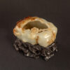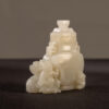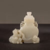 瓶採白玉為質,玉色瑩潤純淨,瓶身大面積光素,展現玉質的溫潤細膩。主體承襲古扁方壺形制,比例玲瓏,頂設方鈕蓋,口沿飾一圈規整回紋,頸部兩側綴以鏤雕附耳,於方正中見精巧。