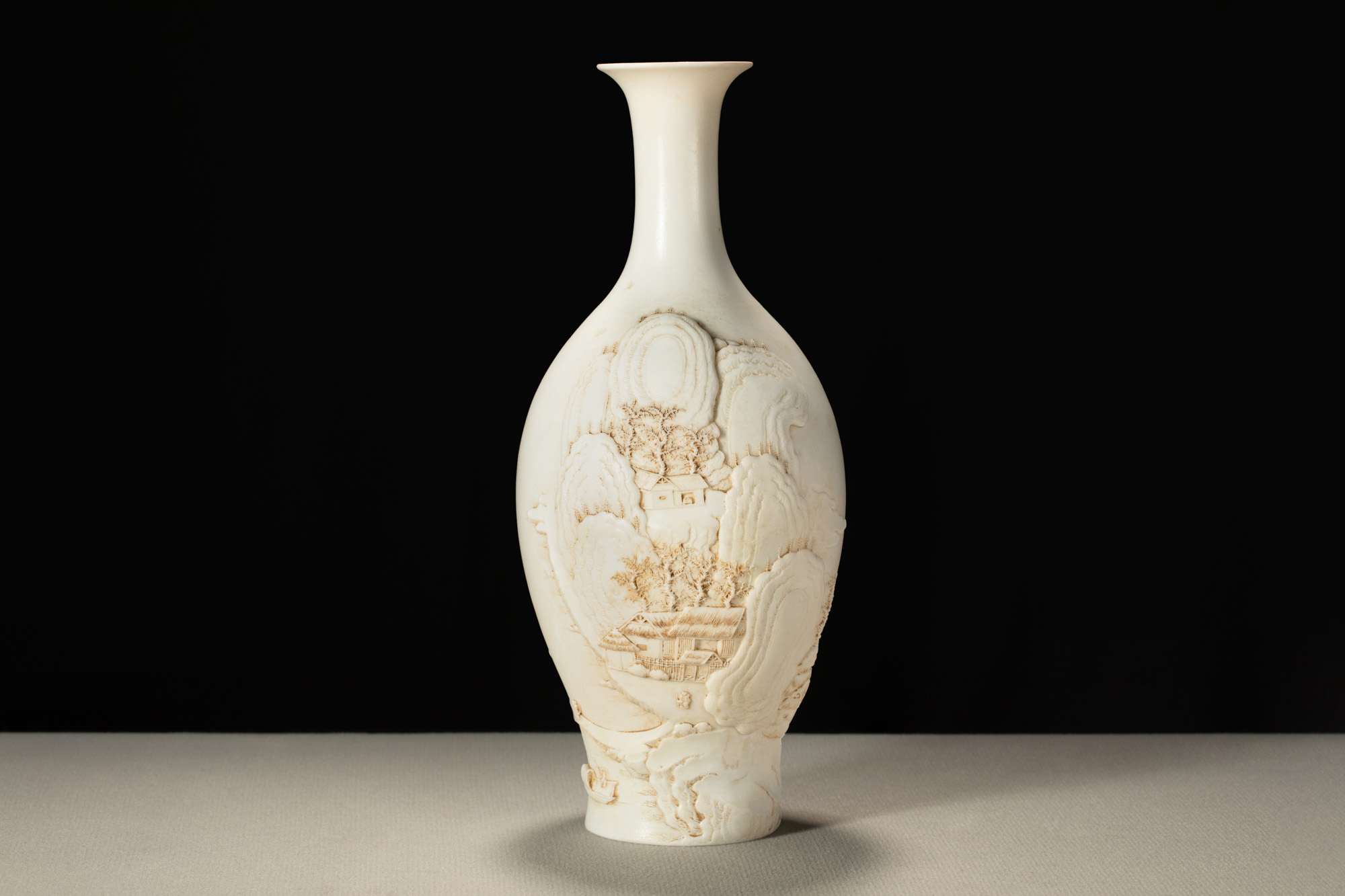 22008.白瓷山水屋舍景圖玉壺春瓶