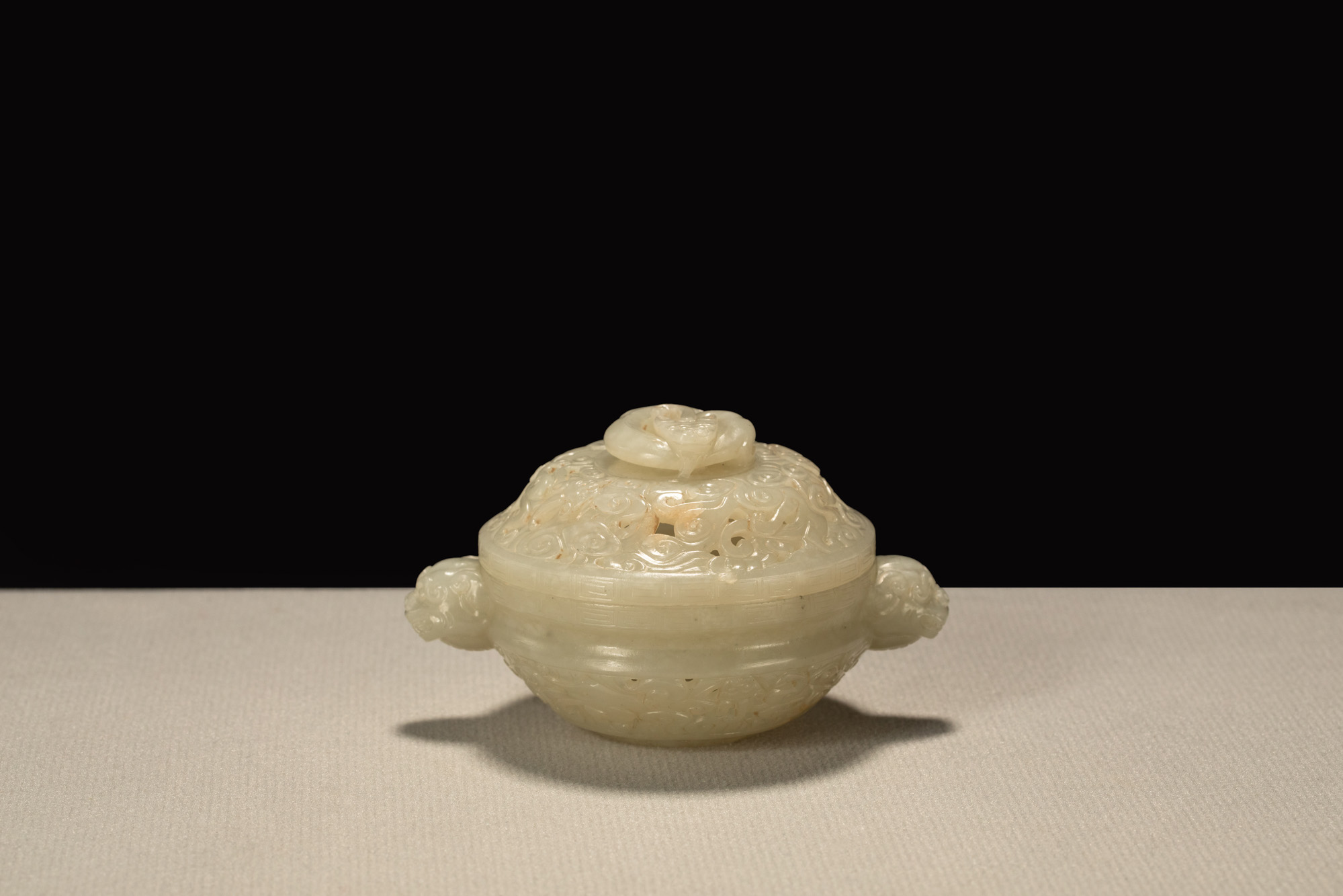 22087.白玉鏤雕螭龍雙獸耳蓋爐