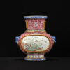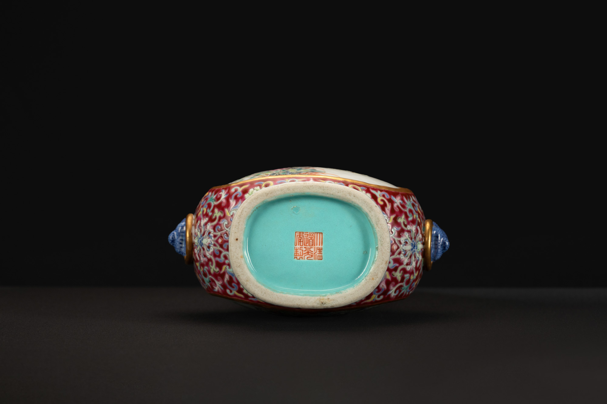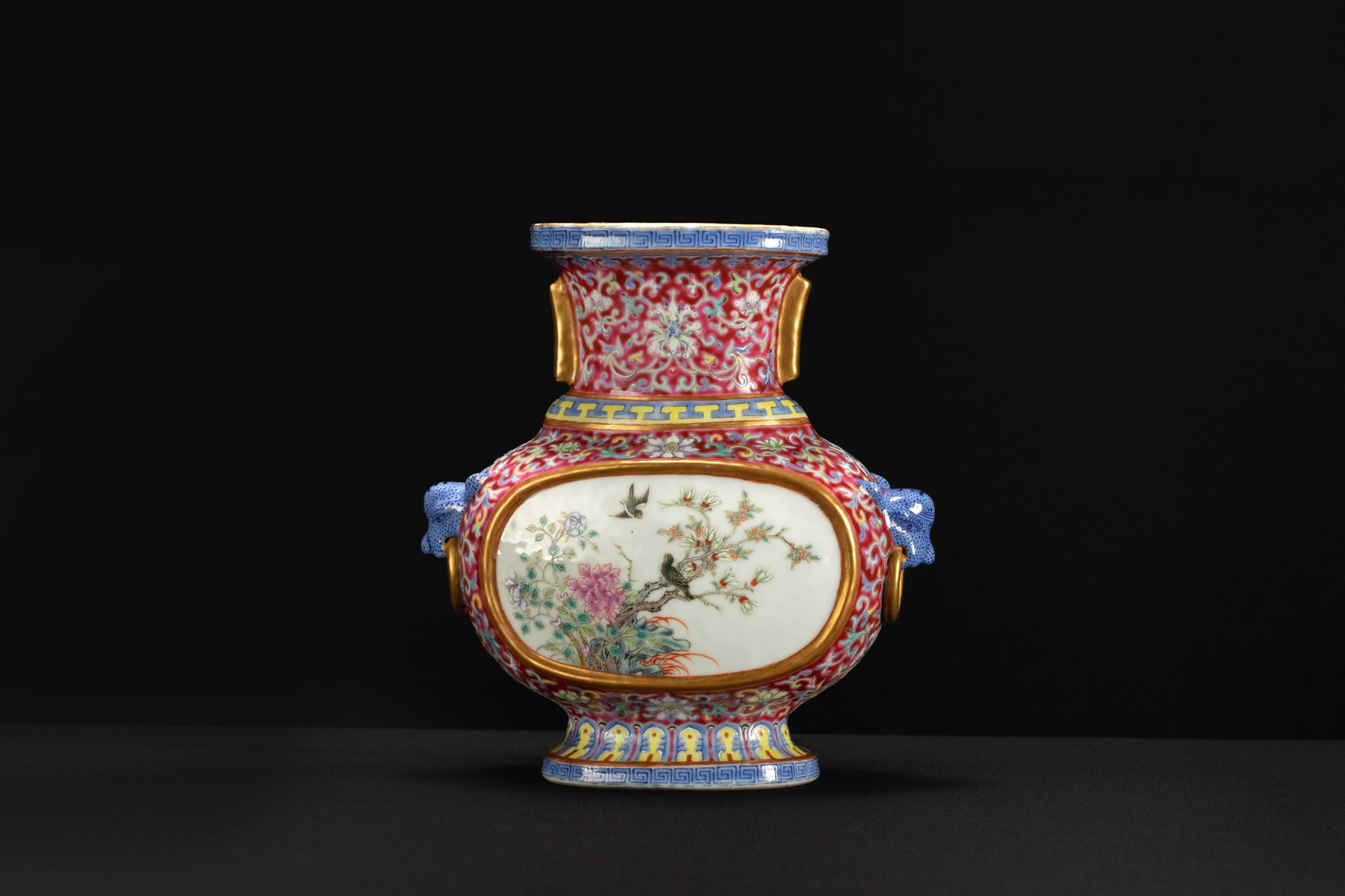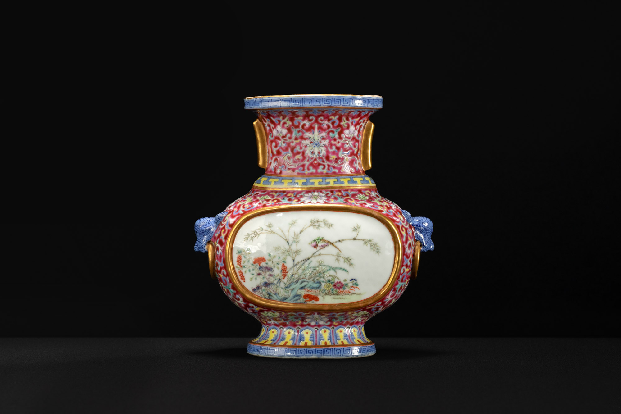 24012.琺瑯彩胭脂紅纏枝蓮開光花鳥圖獸耳扁瓶 來源:香港拍賣行及地產代理有限公司,1990/5/20,Lot 264。