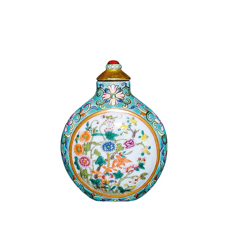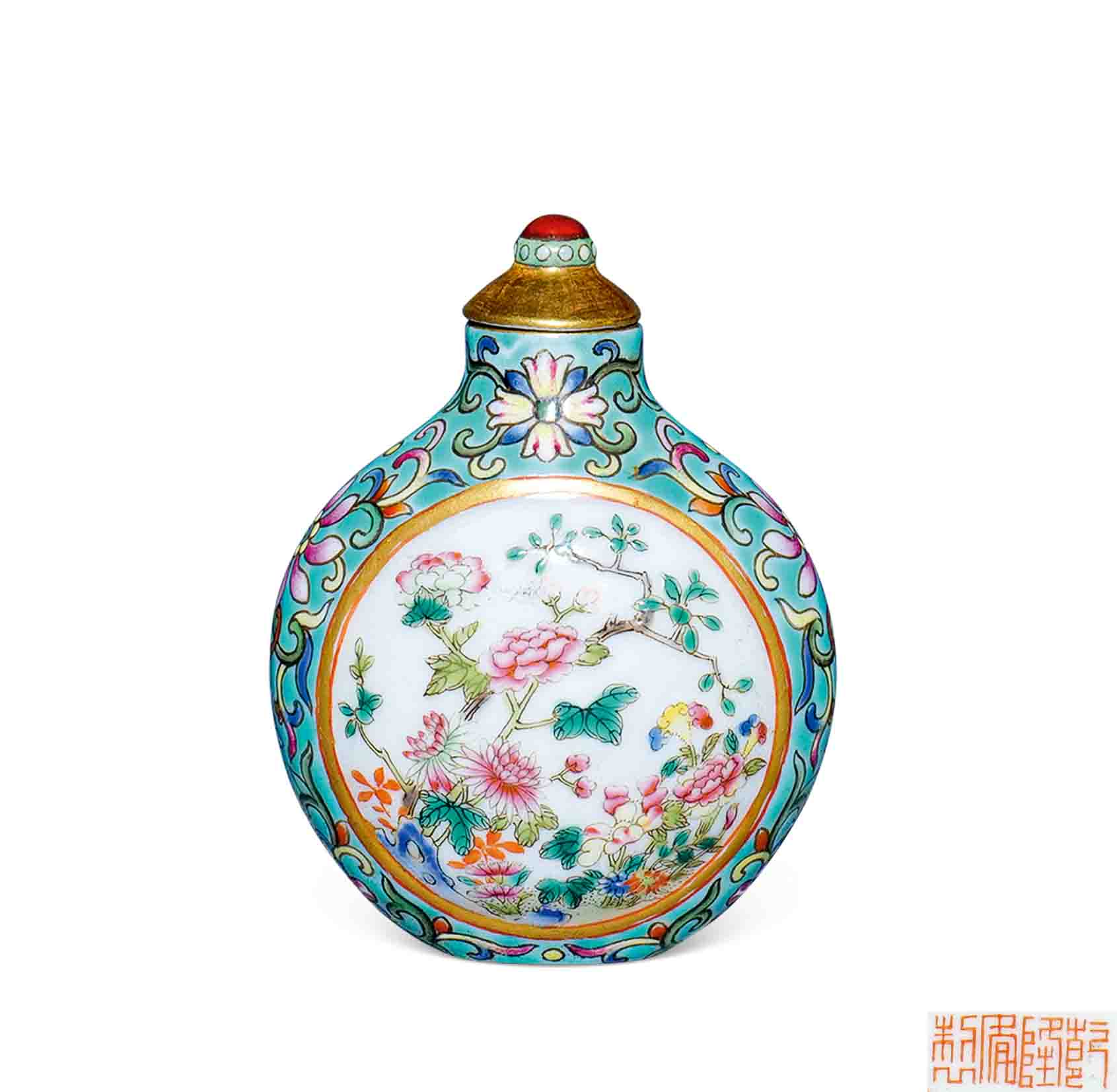 6484.畫琺瑯開光花開富貴圖鼻煙壺《乾隆年制》款